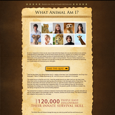 The website was a personality quiz that would ask a series of questions and then provide the user with their "animal" personality. The quiz was built to promote the book "Surviving Your Serengeti" and was a huge success.